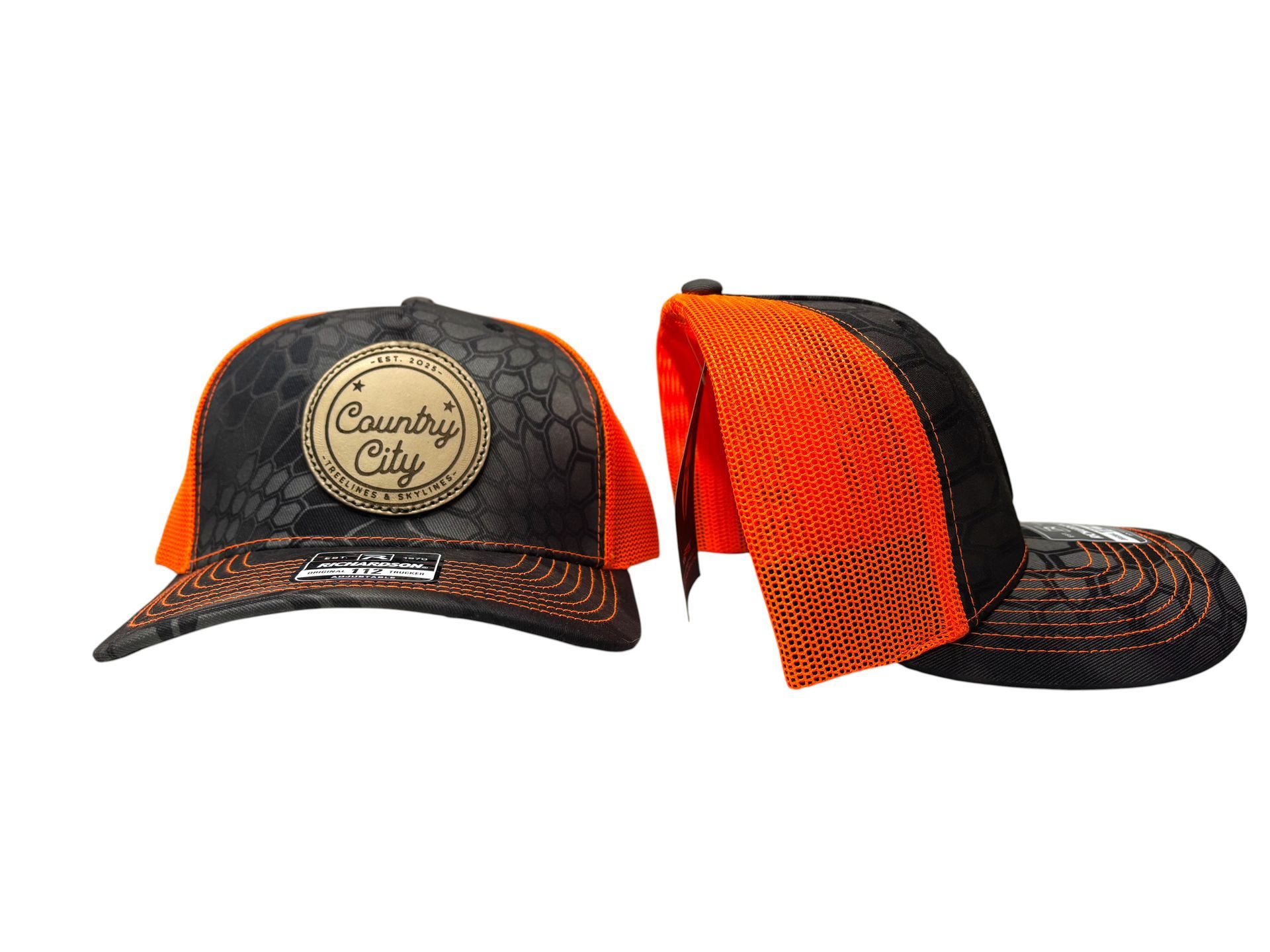 Kryptek Inferno Hat with Light Brown Leather Patch with Stars in multiple colors